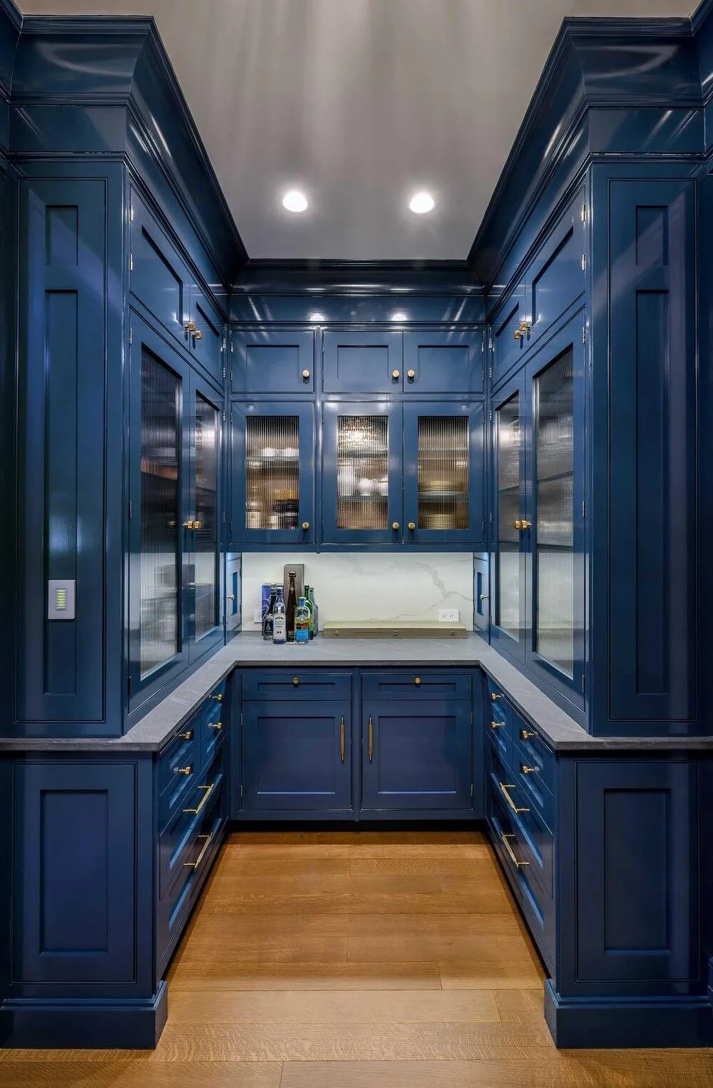 Serving as a bridge between these two islands is a vivacious blue butler’s pantry, a refreshing pop of color against the room’s muted tones. Guarded by two towering stainless steel paneled refrigerators, this pantry is not just about aesthetics. Its glossy finish and true lite doors artfully present the serving ware behind ribbed glass, making them as much a part of the room's decor as functional pieces. The attention to detail doesn’t stop here, as the copper hardware gently contrasts against the marble countertop and backsplash, adding yet another layer to this intricate design dance.