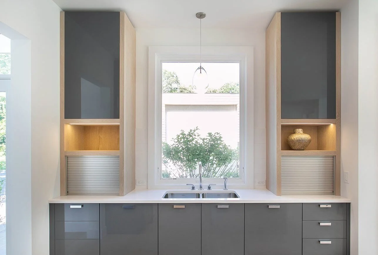 There is a place in the market for high-gloss, European-style minimalist cabinetry. The Bakes & Kropp soft modern aesthetic is not an attempt to replicate the identity of these European manufacturers. Instead, we have taken a modern twist to our transitional products, incorporating elements that may be found in this European style but tempering them with softer materiality and textures such as warm woods. In a soft modern space, contrast is key. We might choose to use a very high-gloss finish for the cabinetry and offset it with a matte wood finish for open shelving or accent panels.