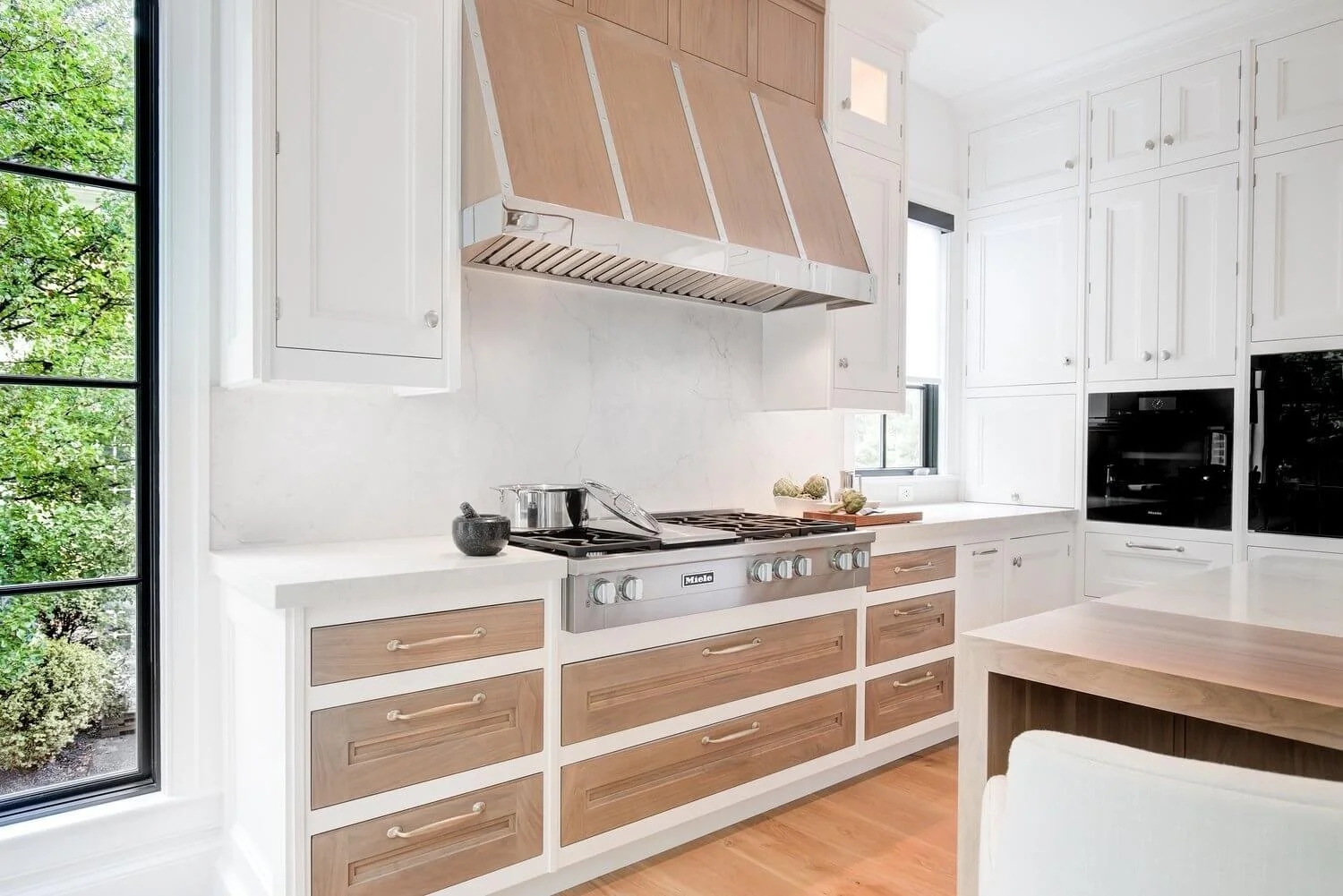 To achieve the clean, transitional aesthetic and complement the penthouse's greater open concept, Ellen turned to our signature White Dove and Pearl Walnut cabinetry finish. This choice not only brought a touch of sophistication to the kitchen but also lent a sense of continuity and harmony throughout the living space.