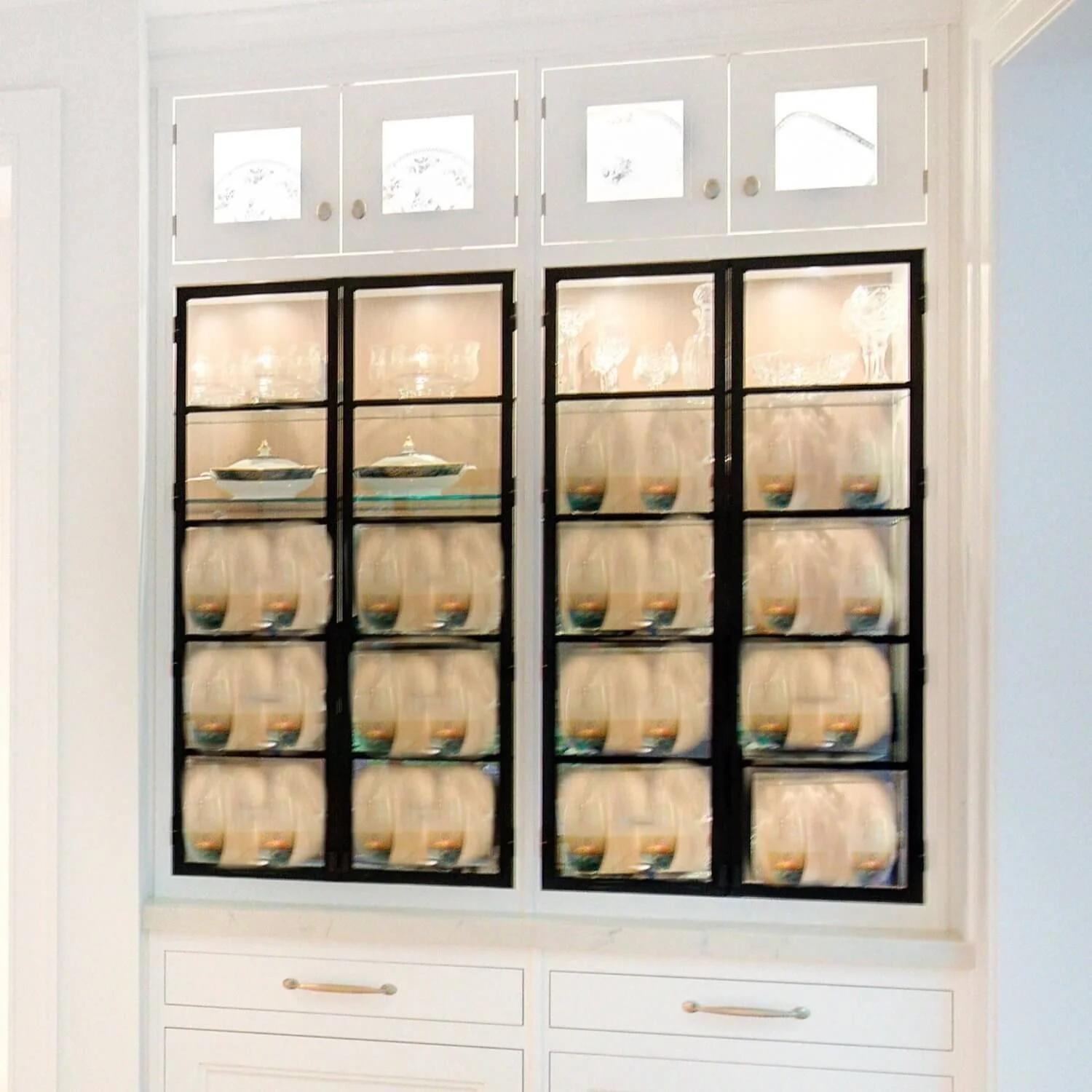 Near the dining area, the outward-facing side of a built-in pantry was ingeniously transformed into a custom bar station. The addition featured stem glass holders and a drop-down serving surface, allowing the homeowner to entertain guests effortlessly. A mirrored back panel served a dual purpose - hiding a structural column and maximizing light, creating an illusion of a larger space within the shallow cabinet.