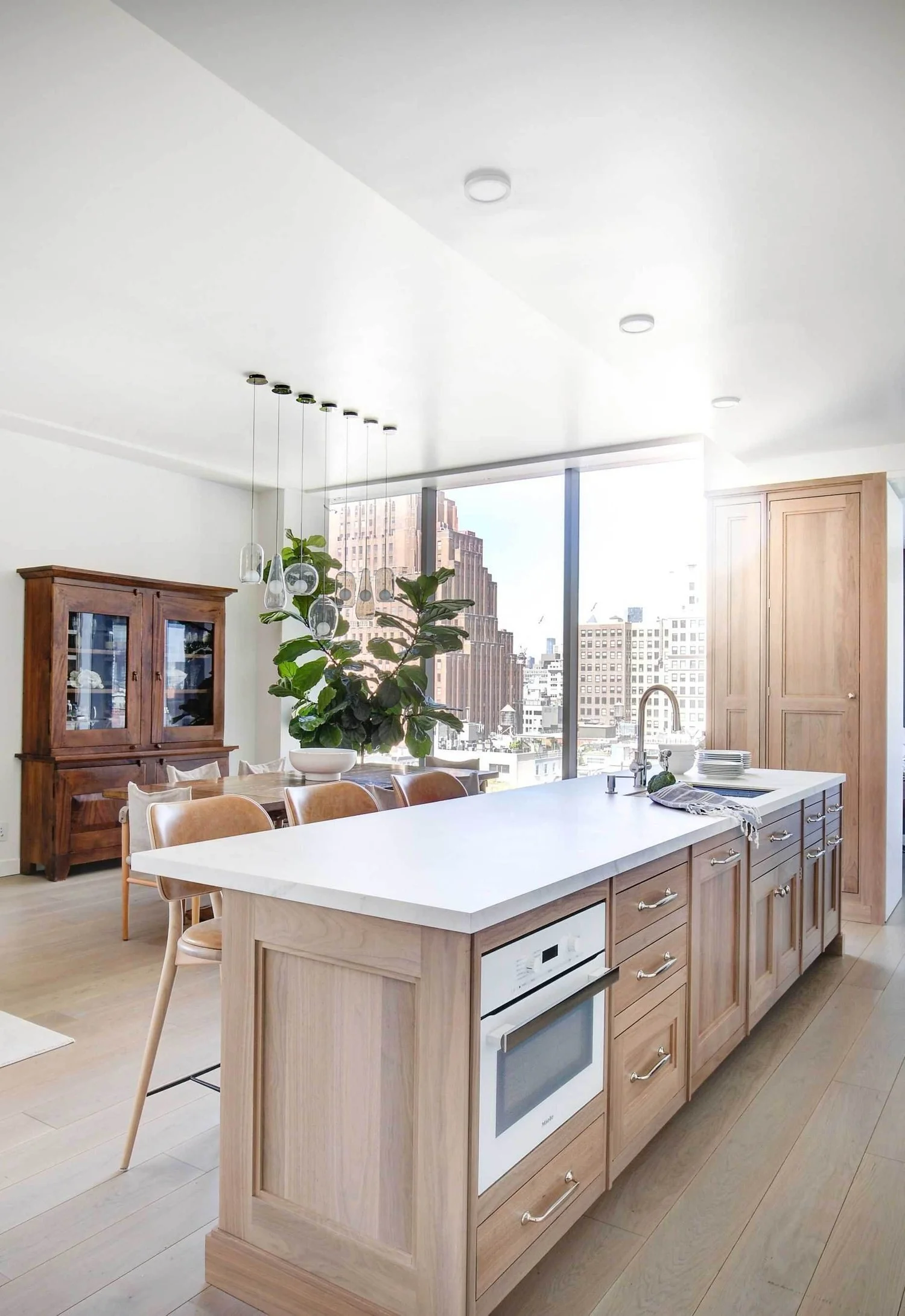 In the heart of Tribeca, a professional organizer found herself challenged to maximize storage in her compact, with standard options on the market. Determined to bring her custom storage solutions to fruition, she sought the expertise of our team to create a beautiful, sensible kitchen with precision and creativity. Working in collaboration with architect Michael Tower, our Senior Designer Ellen Schott transformed this small kitchen into a functional and elegant space that seamlessly blended within the penthouse's open-concept layout. Overcoming architectural obstacles and a tight footprint, the Bakes & Kropp team delivered a remarkable kitchen that incorporated custom built-ins, clever accessories, and essential safety measures for the client's young children.