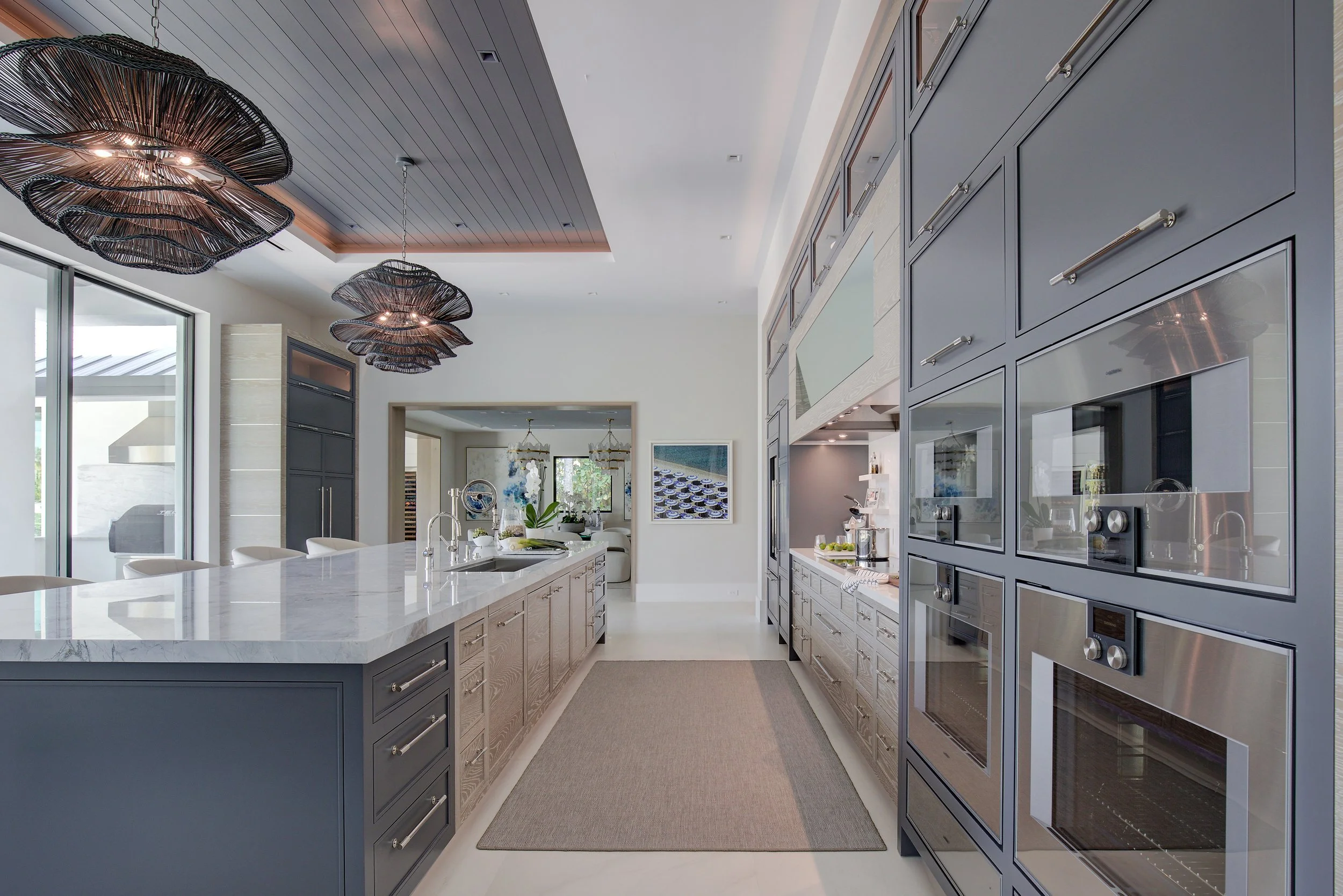 A commanding marble island was also added to aggrandize storage and provide ample space for entertaining. To make use of the abundant square footage in the kitchen, the island was situated far enough away from the prep space to allow for ease of movement and accessibility while cooking. The mix of cerused wood and blue-gray cabinets, along with Armac Martin nickel hardware, was continued on the centerpiece of the kitchen to tie the entire room together. A sculptural wheel faucet was selected for the island sink to create interest and complement the nickel hardware, adding contrast to the warmer wood tones. Overhead, two large woven pendants were installed to resemble coastal plant life, further connecting to the surrounding natural environment. Despite the generous size and open floor plan of the kitchen, the design team achieved a comfortable gathering space that feels like home.