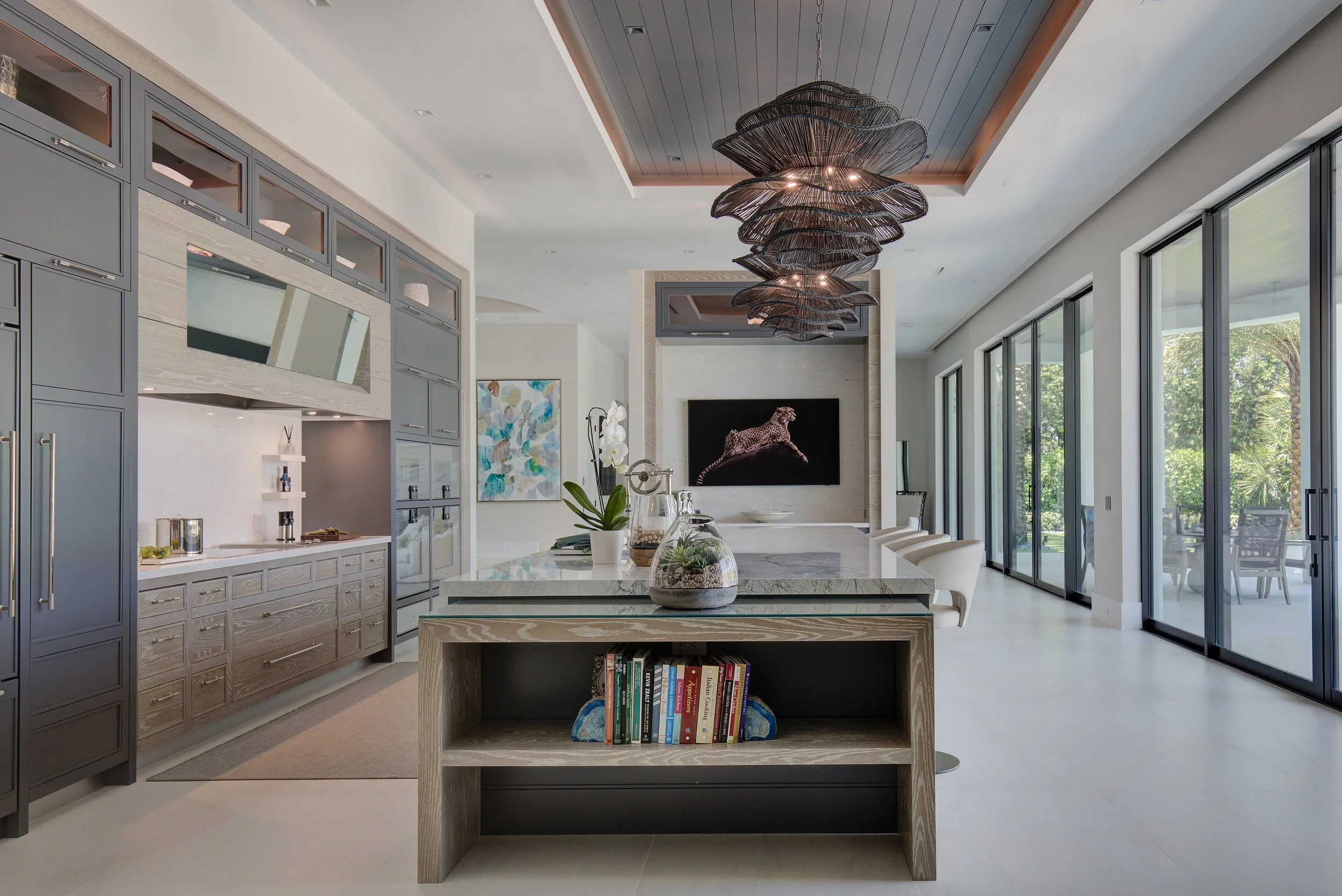 Working directly with our senior designer, our client’s focus was on creating a harmonious design that blurred the lines between indoor and outdoor, and enhanced the natural beauty of the surroundings. It was important to our client that the space have adequate storage solutions while ensuring the sizable room felt intimate and relaxed. With only one prominent wall to work with, our senior designer faced a challenge in unifying the space while maximizing functionality. With floor-to-ceiling windows on the east side of the room, the design team concentrated the appliances and cooking spaces on the opposing wall, offering a front-row view from the kitchen into the stunning backyard and pool area.